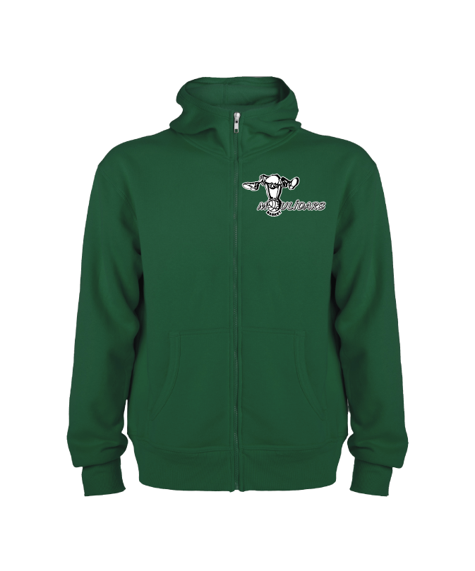 Sweatshirt avec fermeture zippée sur le devant et capuche. Fermeture à glissière assortie. Taille côtelés 2×1 avec élasthanne. Coutures bordées de tissu assorti.